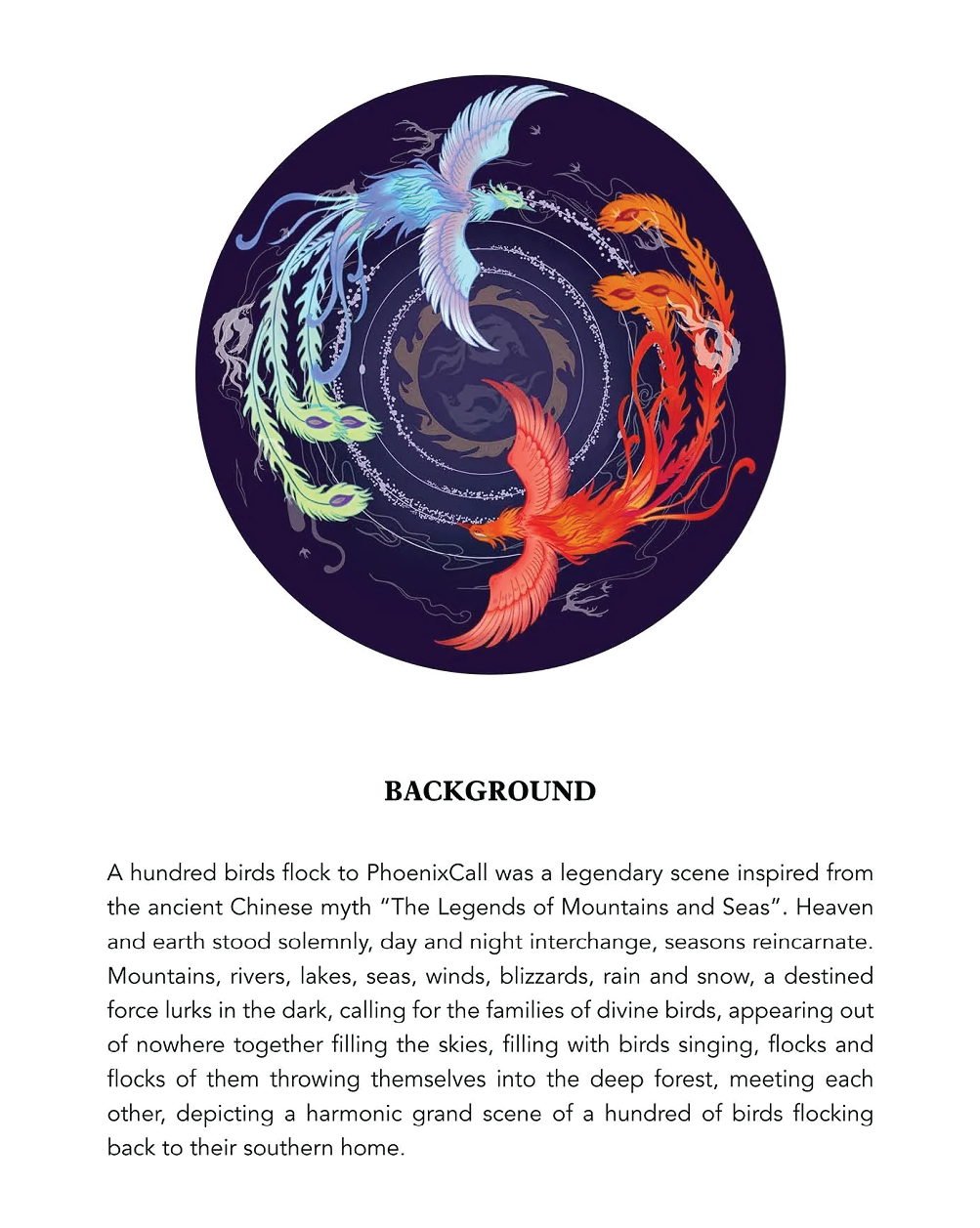 A hundred birds flock to Phoenixcall was a legendary scene inspired by the ancient Chinese myth "The Legends of Mountains and Seas". Heaven and earth stood solemnly, day and night interchange, seasons reincarnate. Mountains, rivers, lakes, seas, winds, blizzards, rain and snow, a destined force lurks in the dark, calling for the families of divine birds, appearing out of nowhere together filling the skies, filling with birds singing, flocks and flocks of them throwing themselves into the deep forest, meeting each other, depicting a harmonic grand scene of a hundred of birds flocking back to their southern home.