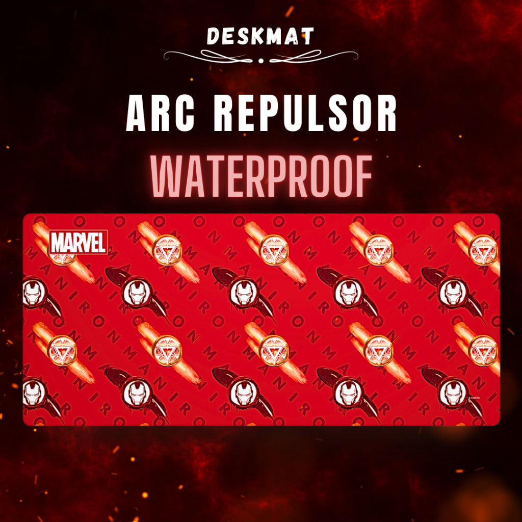 Bold red deskmat with arc reactors, repulsor blasts, and Iron Man’s helmet, finished with subtle 'IRONMAN' to your workspace.
